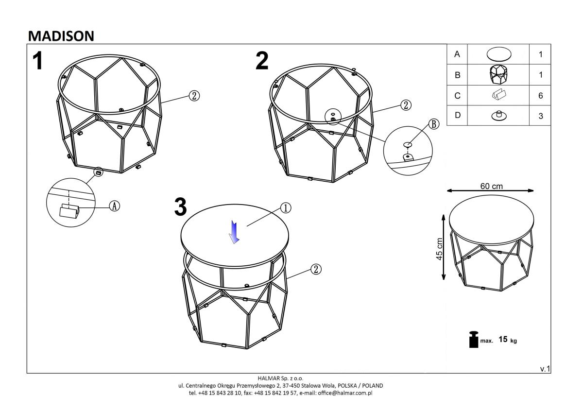 Okrągła ława do salonu MADISON przypomina wyglądem diament, a to dzięki geometrycznym nogom, które tworzą kształt charakterystyczny dla tego pięknego kamienia. Aby powierzchnia podłogi nie uległa porysowaniu nogi zostały wyposażone dodatkowo w gumowe stópki.