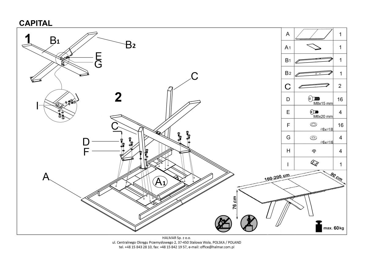 Blat stołu to masywna i ciężka płyta MDF w kolorze złotego dębu. Prostokątny blat stołu ma grubość 4,5 cm i dodatkowo pokryty jest podwójną warstwą laminatu. Blat dzięki temu jest odporniejszy na zarysowanie i wgniecenia, a także jest łatwiejszy wytrzymaniu go w czystości. Stół Capital to stół rozkładany do jadalni do długości 200 cm. W wersji nierozłożonej na długość 160 cm. Rozsuwanie stołu odbywa się płynnie, szybko i bezproblemowo. Masywny blat oparty jest na równie wytrzymałych i ciężkich nogach wykonanych ze stali pomalowanej proszkowo na kolor czarny. Nogi stołu posiadają zabezpieczenia przed rysowaniem podłóg. Stół rodzinny jest bardzo stabilny dzięki przemyślanej konstrukcji i wygląda bardzo designersko. Nie jest wywrotny, a jego waga to 62 kg.