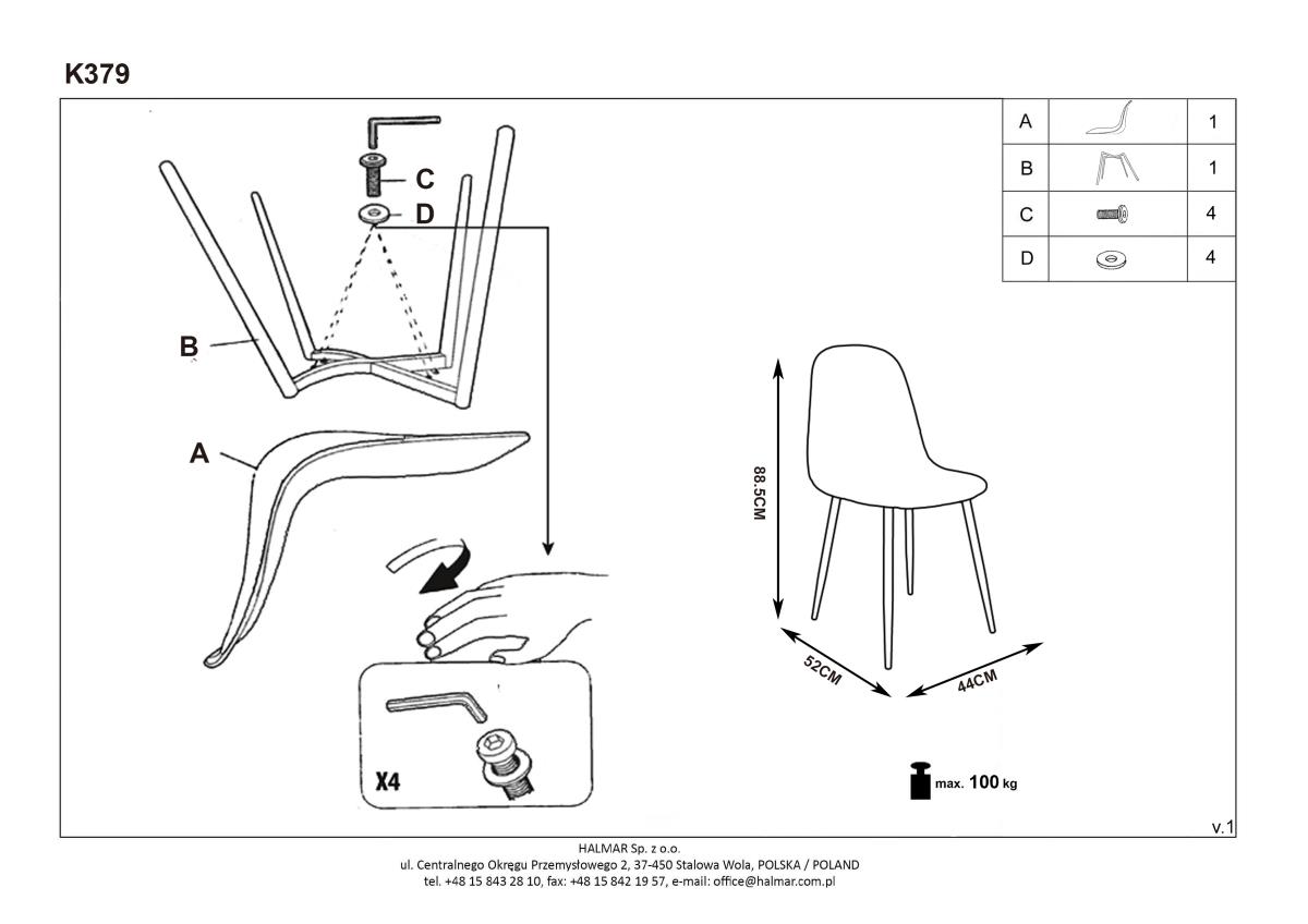 Krzesło jadalniane K379 to wyjątkowo gustowny model o smukłej sylwetce i ozdobiony detalami w kolorze złotym. Siedzisko obite jest eleganckim welurowym materiałem o subtelnym połysku. Nogi wykonane są z mocnej stali w kolorze czarnym i złotym. Mebel jest stabilny i doskonale nadaje się do postawienia przy stole, biurku lub toaletce.